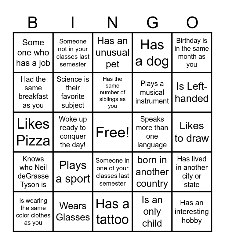This bingo card has a free space and 24 words: Plays a sport, Wears Glasses, Has the same number of siblings as you, Is wearing the same color clothes as you, Birthday is in the same month as you, Some one who has a job, Had the same breakfast as you, Someone not in your classes last semester, Speaks more than one language, Someone in one of your classes last semester, Plays a musical instrument, Likes Pizza, born in another country, Has lived in another city or state, Science is their favorite subject, Is an only child, Likes to draw, Has an unusual pet, Is Left-handed, Woke up ready to conquer the day!, Has an interesting hobby, Knows who Neil deGrasse Tyson is, Has a dog and Has a tattoo.