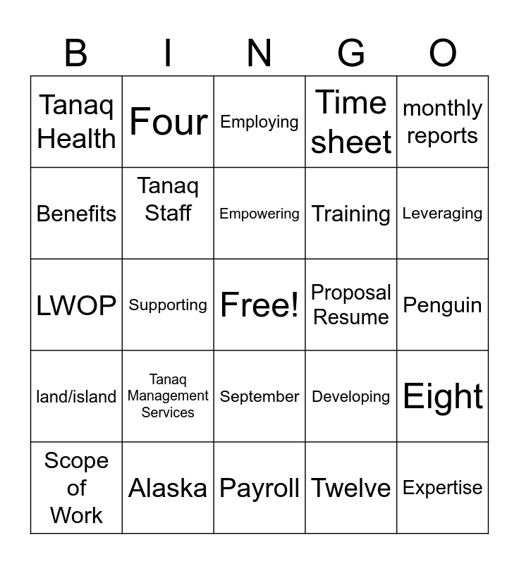 This bingo card has a free space and 24 words: Tanaq Management Services, Alaska, Empowering, Scope of Work, monthly reports, Tanaq Health, Benefits, Four, Proposal Resume, September, Training, LWOP, Developing, Eight, Tanaq Staff, Twelve, Penguin, Employing, Leveraging, Supporting, Expertise, land/island, Time sheet and Payroll.