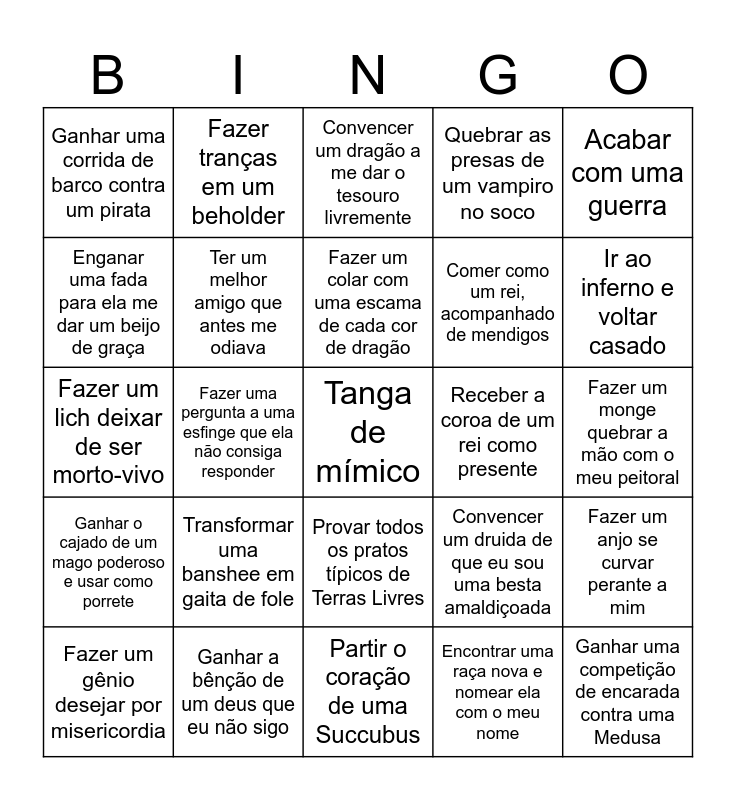 This bingo card has a free space and 24 words: Transformar uma banshee em gaita de fole, Ganhar a bênção de um deus que eu não sigo, Fazer um colar com uma escama de cada cor de dragão, Fazer um gênio desejar por misericordia, Acabar com uma guerra, Ganhar uma corrida de barco contra um pirata, Enganar uma fada para ela me dar um beijo de graça, Fazer tranças em um beholder, Receber a coroa de um rei como presente, Provar todos os pratos típicos de Terras Livres, Comer como um rei, acompanhado de mendigos, Fazer um lich deixar de ser morto-vivo, Convencer um druida de que eu sou uma besta amaldiçoada, Fazer um anjo se curvar perante a mim, Ter um melhor amigo que antes me odiava, Encontrar uma raça nova e nomear ela com o meu nome, Fazer um monge quebrar a mão com o meu peitoral, Convencer um dragão a me dar o tesouro livremente, Ir ao inferno e voltar casado, Fazer uma pergunta a uma esfinge que ela não consiga responder, Ganhar uma competição de encarada contra uma Medusa, Ganhar o cajado de um mago poderoso e usar como porrete, Quebrar as presas de um vampiro no soco and Partir o coração de uma Succubus.