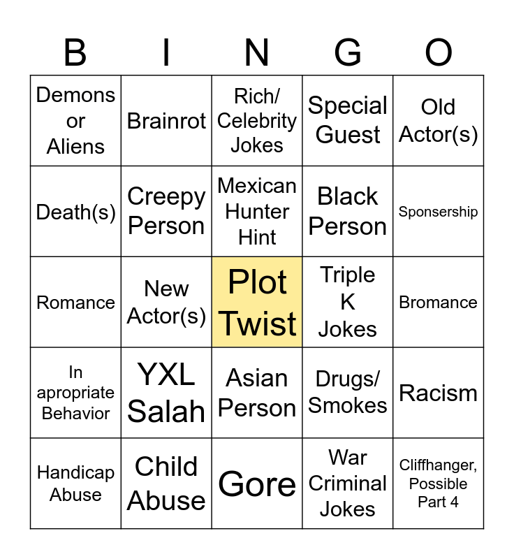 This bingo card has a free space and 24 words: YXL Salah, Child Abuse, Mexican Hunter Hint, Handicap Abuse, Old Actor(s), Demons or Aliens, Death(s), Brainrot, Triple K Jokes, Asian Person, Black Person, Romance, Drugs/ Smokes, Racism, Creepy Person, War Criminal Jokes, Bromance, Rich/ Celebrity Jokes, Sponsership, New Actor(s), Cliffhanger, Possible Part 4, In apropriate Behavior, Special Guest and Gore.