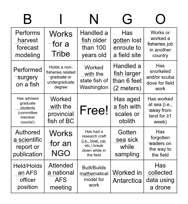 This bingo card has 24 images, a free space and 24 words: Works for an NGO, Attended a national AFS meeting, Worked with the state fish of Washington, Held/Holds an AFS officer position, Works or worked a fisheries job in another country, Performs harvest forecast modeling, Performed surgery on a fish, Works for a Tribe, Has aged a fish with scales or otolith, Has had a research craft (i.e., boat, car, etc.) break down while in the field, Handled a fish larger than 6 feet (2 meters), Has advised graduate students (committee member counts!), Gotten sea sick while sampling, Has forgotten waders on the way to the field, Holds a non-fisheries related graduate or undergraduate degree, Worked in Antarctica, Has worked at sea (i.e., away from land for ≥1 week), Handled a fish older than 100 years old, Has snorkeled and/or scuba dove for field work, Worked with the provincial fish of BC, Has collected data using a drone, Authored a scientific report or publication, Has gotten lost enroute to a field site and Built/Builds mathematical model for work.