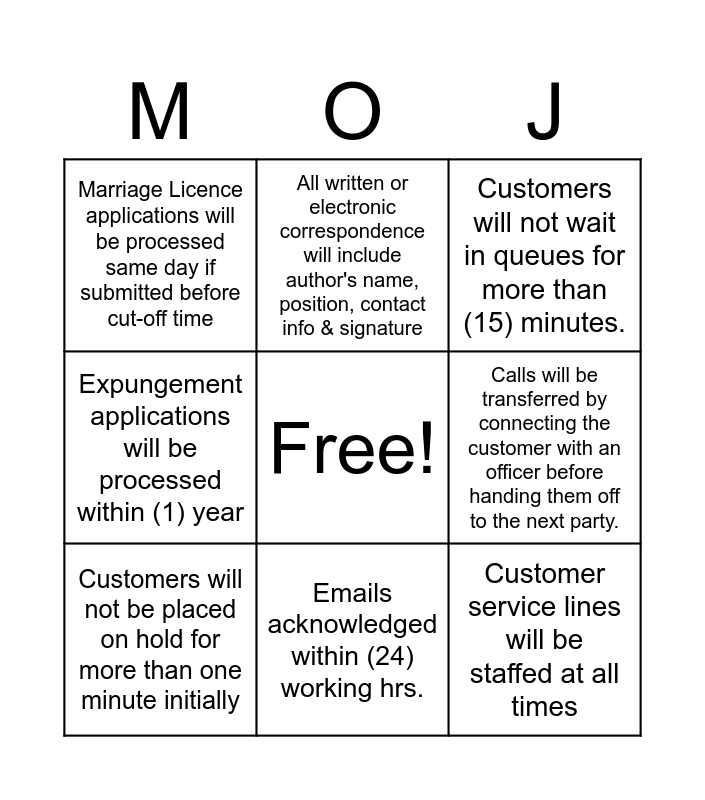 This bingo card has a free space and 11 words: Phones answered within (3) rings, Emails acknowledged within (24) working hrs., Customer service lines will be staffed at all times, Customers will not be placed on hold for more than one minute initially, All written or electronic correspondence will include author's name, position, contact info & signature, Customers will not wait in queues for more than (15) minutes., Calls will be transferred by connecting the customer with an officer before handing them off to the next party., All complaints will be acknowledged within (48) working hrs., Expungement applications will be processed within (1) year, Marriage Licence applications will be processed same day if submitted before cut-off time and RJ will provide sensitizations to stakeholders on the agreed dates..