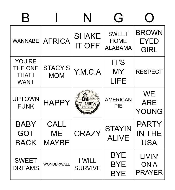 This bingo card has a free space and 49 words: DONT STOP BELIEVIN', LIVIN' ON A PRAYER, I WANT IT THAT WAY, I WILL SURVIVE, CALL ME MAYBE, SWEET CAROLINE, AFRICA, MAN! I FEEL LIKE A WOMAN!, YOU'RE THE ONE THAT I WANT, IM GONNA BE (500 MILES), STACY'S MOM, SWEET HOME ALABAMA, PARTY IN THE USA, STAYIN ALIVE, TAKE ME HOME, COUNTRY ROADS, WE WILL ROCK YOU, Y.M.C.A, AMERICAN PIE, ALL STAR, BROWN EYED GIRL, HAPPY, BYE BYE BYE, WANNABE, IT'S MY LIFE, I WANNA DANCE WITH SOMEBODY, RESPECT, SWEET DREAMS, STAND BY ME, CRAZY, BABY GOT BACK, SINCE U BEEN GONE, SWEET CHILD O' MINE, HEY YA!, FOLLOW ME, WONDERWALL, JACK & DIANE, RETURN OF THE MACK, PIANO MAN, WE ARE YOUNG, WAGON WHEEL, THANK GOD IM A COUNTRY BOY, CHICKEN FRIED, GIRLD JUST WANT TO HAVE FUN, MR. BRIGHTSIDE, UPTOWN FUNK, SHAKE IT OFF, ALL THE SMALL THINGS, RIDE WIT ME and FORGET YOU.