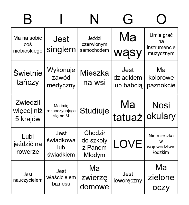 This bingo card has 25 words: Jest świadkową lub świadkiem, Ma zwierzę domowe, Mieszka na wsi, Jest nauczycielem, Umie grać na instrumencie muzycznym, Ma na sobie coś niebieskiego, Świetnie tańczy, Jest singlem, Ma tatuaż, Chodził do szkoły z Panem Młodym, Jest dziadkiem lub babcią, Zwiedził więcej niż 5 krajów, LOVE, Nie mieszka w województwie łódzkim, Wykonuje zawód medyczny, Ma zielone oczy, Nosi okulary, Jeździ czerwionym samochodem, Ma kolorowe paznokcie, Ma imię rozpoczynające się na M, Studiuje, Jest właścicielem biznesu, Lubi jeździć na rowerze, Ma wąsy and Jest leworęczny.