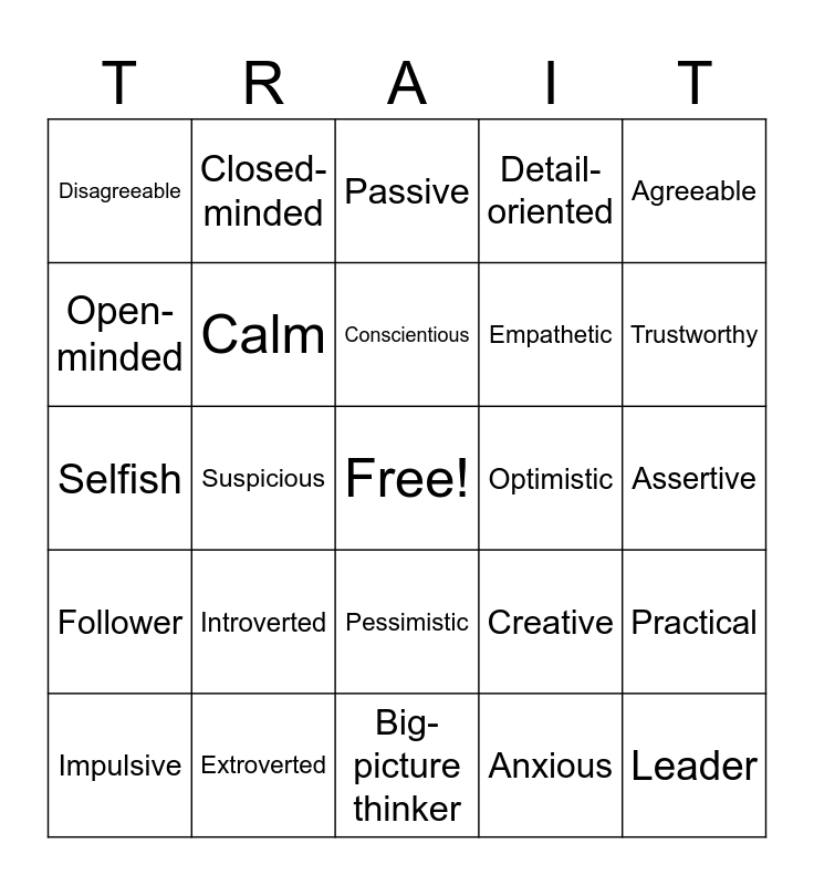 This bingo card has a free space and 24 words: Introverted, Extroverted, Conscientious, Impulsive, Agreeable, Disagreeable, Open-minded, Closed-minded, Optimistic, Pessimistic, Empathetic, Selfish, Creative, Practical, Calm, Anxious, Assertive, Passive, Trustworthy, Suspicious, Leader, Follower, Detail-oriented and Big-picture thinker.