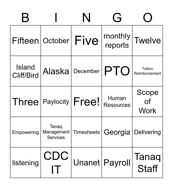 This bingo card has a free space and 24 words: Tanaq Management Services, CDC IT, December, listening, Twelve, Fifteen, Island Cliff/Bird, October, Human Resources, Timesheets, PTO, Three, Georgia, Delivering, Alaska, Payroll, Scope of Work, Five, Tuition Reimbursement, Paylocity, Tanaq Staff, Empowering, monthly reports and Unanet.