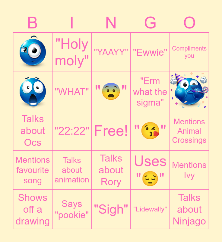 This bingo card has 3 images, a free space and 24 words: Uses "😔", "HELP", "Erm what the sigma", "Sigh", "YAAYY", "Holy moly", Mentions favourite song, "😘", Mentions Ivy, Talks about Ocs, "Ewwie", Shows off a drawing, Says "pookie", "💀", "WHAT", "😨", Talks about animation, Mentions Animal Crossings, "Lidewally", "22:22", Talks about Ninjago, Talks about Rory, Compliments you and "EEK".