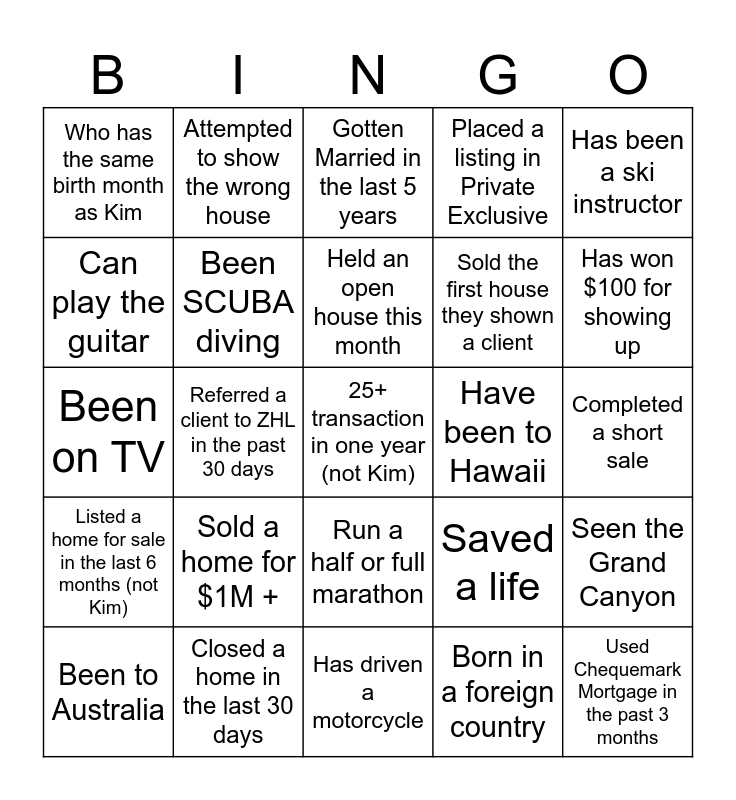 This bingo card has a free space and 24 words: Sold a home for $1M +, Closed a home in the last 30 days, Held an open house this month, Been to Australia, Has been a ski instructor, Who has the same birth month as Kim, Can play the guitar, Attempted to show the wrong house, Have been to Hawaii, Run a half or full marathon, Sold the first house they shown a client, Been on TV, Saved a life, Seen the Grand Canyon, Been SCUBA diving, Born in a foreign country, Completed a short sale, Gotten Married in the last 5 years, Has won $100 for showing up, Referred a client to ZHL in the past 30 days, Used Chequemark Mortgage in the past 3 months, Listed a home for sale in the last 6 months (not Kim), Placed a listing in Private Exclusive and Has driven a motorcycle.