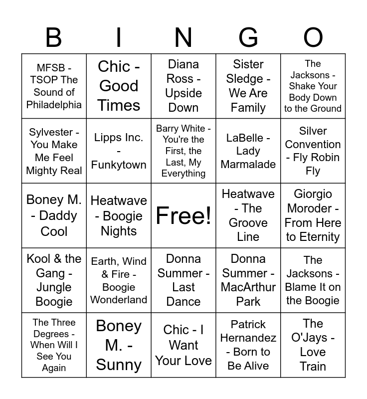 This bingo card has a free space and 75 words: Bee Gees - Stayin' Alive, Donna Summer - I Feel Love, Diana Ross - Upside Down, Chic - Le Freak, Gloria Gaynor - I Will Survive, The Trammps - Disco Inferno, Donna Summer - Hot Stuff, Village People - Y.M.C.A., KC and the Sunshine Band - That's the Way I Like It, Bee Gees - Night Fever, Earth, Wind & Fire - September, Thelma Houston - Don't Leave Me This Way, Barry White - You're the First, the Last, My Everything, Sylvester - You Make Me Feel Mighty Real, Candi Staton - Young Hearts Run Free, Heatwave - Boogie Nights, A Taste of Honey - Boogie Oogie Oogie, The O'Jays - Love Train, Harold Melvin & The Blue Notes - Don't Leave Me This Way, The Jacksons - Shake Your Body Down to the Ground, Kool & the Gang - Ladies' Night, Boney M. - Daddy Cool, Lipps Inc. - Funkytown, Chic - Good Times, Sister Sledge - We Are Family, Donna Summer - Bad Girls, KC and the Sunshine Band - Get Down Tonight, The Commodores - Brick House, Wild Cherry - Play That Funky Music, George McCrae - Rock Your Baby, ABBA - Dancing Queen, Boney M. - Rasputin, Amii Stewart - Knock on Wood, Donna Summer - MacArthur Park, Silver Convention - Fly Robin Fly, LaBelle - Lady Marmalade, Andrea True Connection - More More More, Hot Chocolate - You Sexy Thing, Giorgio Moroder - From Here to Eternity, Patrick Hernandez - Born to Be Alive, Evelyn Champagne King - Shame, Vicki Sue Robinson - Turn the Beat Around, The Hues Corporation - Rock the Boat, Carl Douglas - Kung Fu Fighting, Tavares - Heaven Must Be Missing an Angel, Rose Royce - Car Wash, The Three Degrees - When Will I See You Again, MFSB - TSOP The Sound of Philadelphia, Dr. Buzzard's Original Savannah Band - Cherchez La Femme, Odyssey - Native New Yorker, Bee Gees - How Deep Is Your Love, Donna Summer - Last Dance, Diana Ross - Love Hangover, Chic - Dance Dance Dance Yowsah Yowsah Yowsah, Gloria Gaynor - Never Can Say Goodbye, The Trammps - Hold Back the Night, Donna Summer - Dim All the Lights, Village People - Macho Man, KC and the Sunshine Band - Keep It Comin' Love, Bee Gees - Jive Talkin', Earth, Wind & Fire - Boogie Wonderland, Thelma Houston - If You Feel It, Barry White - Can't Get Enough of Your Love Babe, Sylvester - Dance Disco Heat, Candi Staton - Victim, Heatwave - The Groove Line, A Taste of Honey - Disco Dance, The O'Jays - I Love Music, Harold Melvin & The Blue Notes - Bad Luck, The Jacksons - Blame It on the Boogie, Kool & the Gang - Jungle Boogie, Boney M. - Sunny, Lipps Inc. - Rock It, Chic - I Want Your Love and Sister Sledge - Lost in Music.