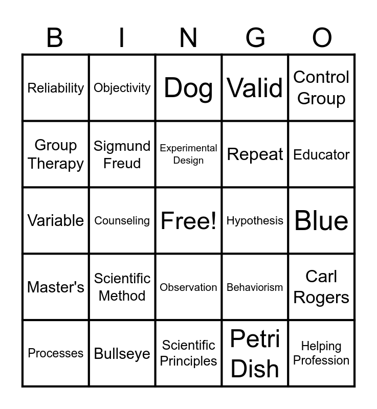 This bingo card has a free space and 24 words: Scientific Method, Bullseye, Experimental Design, Processes, Control Group, Reliability, Group Therapy, Objectivity, Hypothesis, Observation, Repeat, Variable, Behaviorism, Carl Rogers, Sigmund Freud, Petri Dish, Blue, Dog, Educator, Counseling, Helping Profession, Master's, Valid and Scientific Principles.