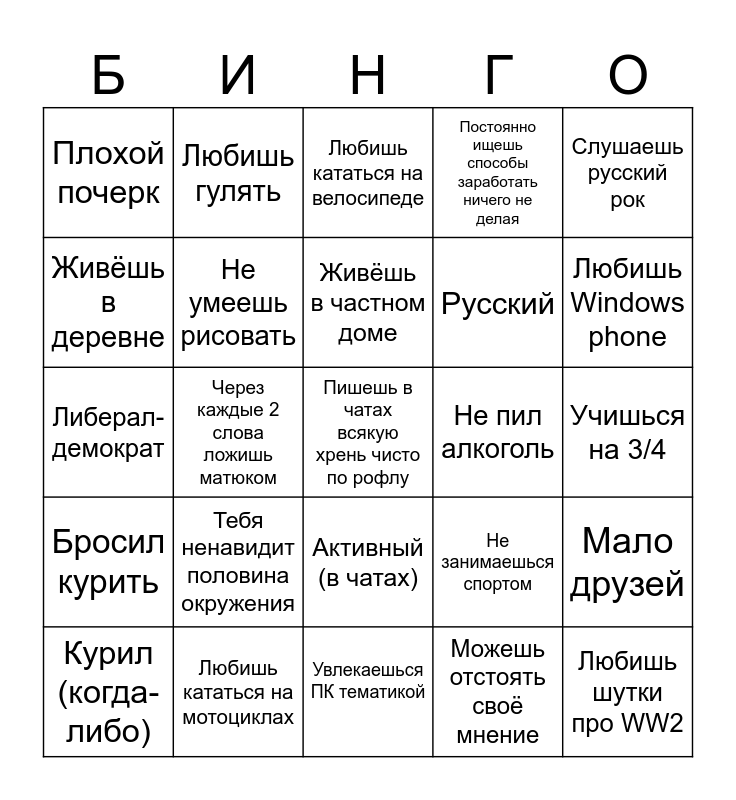 This bingo card has a free space and 24 words: Тебя ненавидит половина окружения, Любишь кататься на мотоциклах, Живёшь в частном доме, Курил (когда-либо), Слушаешь русский рок, Плохой почерк, Живёшь в деревне, Любишь гулять, Не пил алкоголь, Активный (в чатах), Русский, Либерал-демократ, Не занимаешься спортом, Мало друзей, Не умеешь рисовать, Можешь отстоять своё мнение, Учишься на 3/4, Любишь кататься на велосипеде, Любишь Windows phone, Через каждые 2 слова ложишь матюком, Любишь шутки про WW2, Бросил курить, Постоянно ищешь способы заработать ничего не делая and Увлекаешься ПК тематикой.