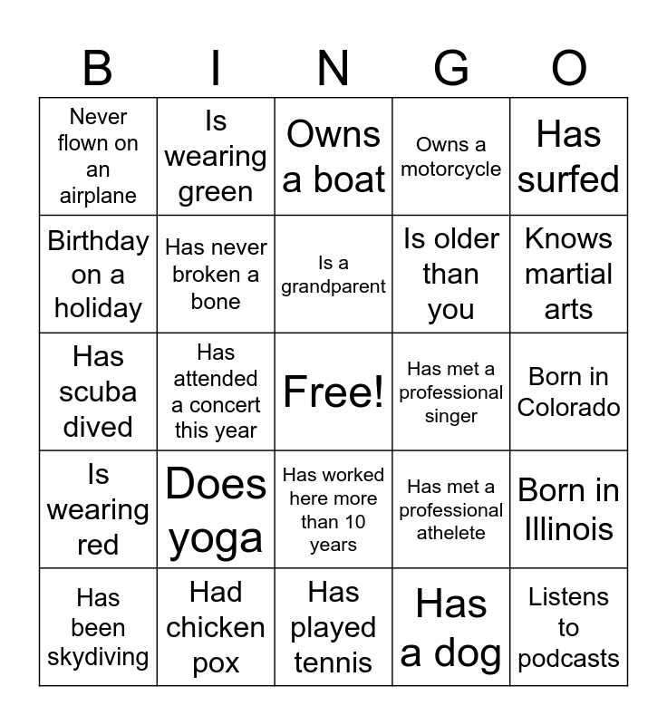 This bingo card has a free space and 88 words: Has worked here less than 1 year, Has worked here more than 5 years, Has worked here more than 10 years, Has worked here more than 20 years, Is an elected official, Has more than a one-hour commute, Is a Viking fan, Is a Packer fan, Is a Bears fan, Have been to a Disney theme park, Born in Wisconsin, Born in Iowa, Born in Illinois, Born in Colorado, Is a twin, Is a grandparent, Has a tattoo, Is left-handed, Is a vegetarian, Had a baby in last year, Bought a car this past year, Attended a City Council meeting, Has scuba dived, Has a cat, Has a dog, Has a snake, Served in the military, Has run in a marathon, Has taken a cruise, Brews beer, Owns a boat, Owns a motorcycle, Visited three continents, Speaks 2+ languages, Does yoga, Birthday on a holiday, Never flown on an airplane, Same birth month as you, Rides horses, Knows martial arts, Has attended a concert this year, Appeared in a movie, Knows ASL, Has met a professional athelete, Has met a professional singer, Has met a movie star, Has solved Rubik’s Cube, Can play the guitar, Has worked in another country, Is older than you, Is younger than you, Can juggle, Has a computer at home, Has used a typewriter, Doesn’t drink coffee, Is allergic to cats, Is wearing red, Is wearing green, Is wearing blue, Is wearing black, Is wearing brown, Is wearing yellow, Has a birthday this month, Can play the piano, Has changed a tire, Had chicken pox, Does not have Facebook account, Has never broken a bone, Has been skydiving, Listens to podcasts, Can drive stick, Is a Roseville resident, Has been on a helicopter, Has surfed, Works out before work, Has broken a bone, Acted in a play, Has golfed, Has played tennis, Has played pickleball, Has been in a band, Has a library card, Does not have Netflix, Has a cabin, Has kids, Born in Minnesota, Is the oldest sibling and Is the youngest sibling.