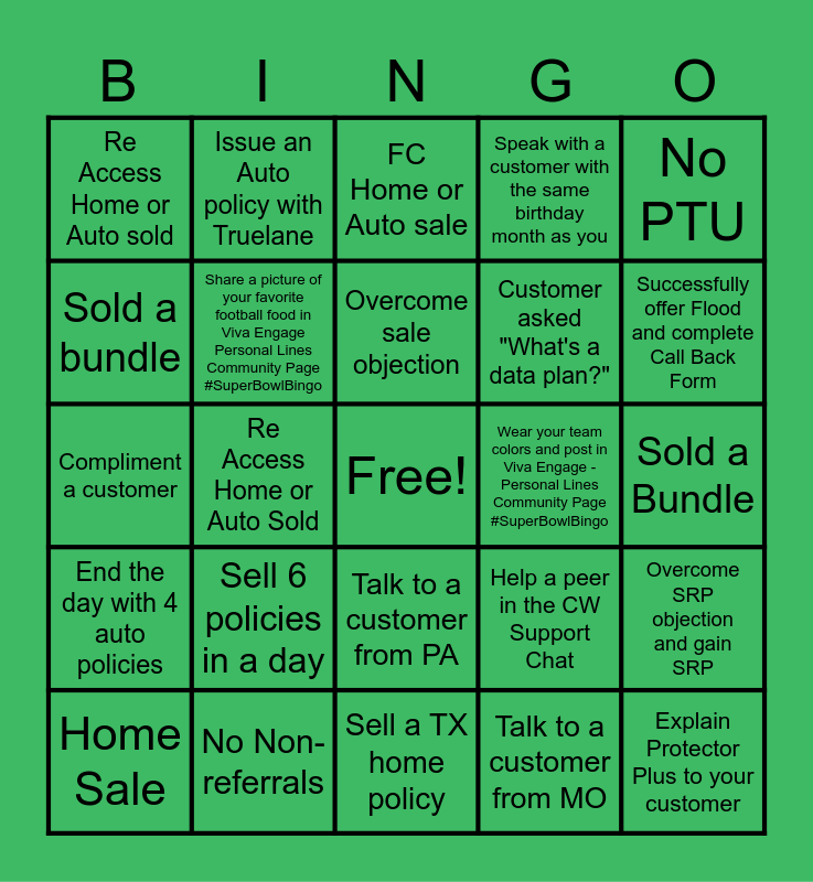 This bingo card has a free space and 24 words: Sell 6 policies in a day, No Non- referrals, Overcome sale objection, Home Sale, No PTU, Re Access Home or Auto sold, Sold a bundle, Issue an Auto policy with Truelane, Wear your team colors and post in Viva Engage - Personal Lines Community Page #SuperBowlBingo, Talk to a customer from PA, Customer asked "What's a data plan?", Compliment a customer, Help a peer in the CW Support Chat, Overcome SRP objection and gain SRP, Share a picture of your favorite football food in Viva Engage Personal Lines Community Page #SuperBowlBingo, Talk to a customer from MO, Sold a Bundle, FC Home or Auto sale, Successfully offer Flood and complete Call Back Form, Re Access Home or Auto Sold, Explain Protector Plus to your customer, End the day with 4 auto policies, Speak with a customer with the same birthday month as you and Sell a TX home policy.