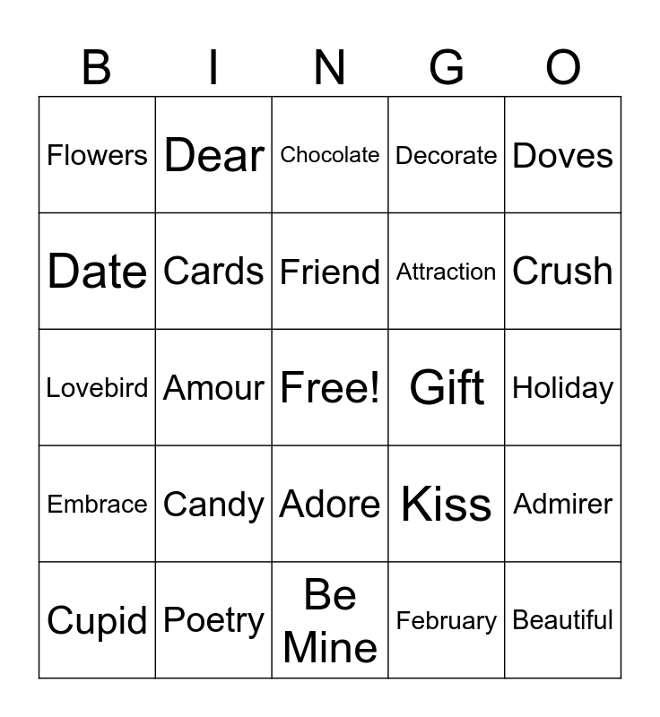 This bingo card has a free space and 29 words: Cupid, Sweetheart, Amour, Love, Flowers, Chocolate, Cards, Candy, Gift, Poetry, Holiday, Beautiful, Be Mine, February, Crush, Bow and Arrow, Adore, Embrace, Doves, Lovebird, Kiss, Hug, Attraction, Date, Decorate, Dear, Admirer, Friend and Woo.