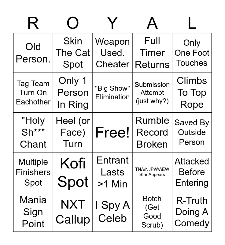 This bingo card has a free space and 24 words: Kofi Spot, NXT Callup, "Big Show" Elimination, Mania Sign Point, Only One Foot Touches, Old Person., Tag Team Turn On Eachother, Skin The Cat Spot, Rumble Record Broken, Entrant Lasts >1 Min, Submission Attempt (just why?), "Holy Sh**" Chant, TNA/NJPW/AEW Star Appears, Attacked Before Entering, Only 1 Person In Ring, Botch (Get Good Scrub), Saved By Outside Person, Weapon Used. Cheater, Climbs To Top Rope, Heel (or Face) Turn, R-Truth Doing A Comedy, Multiple Finishers Spot, Full Timer Returns and I Spy A Celeb.