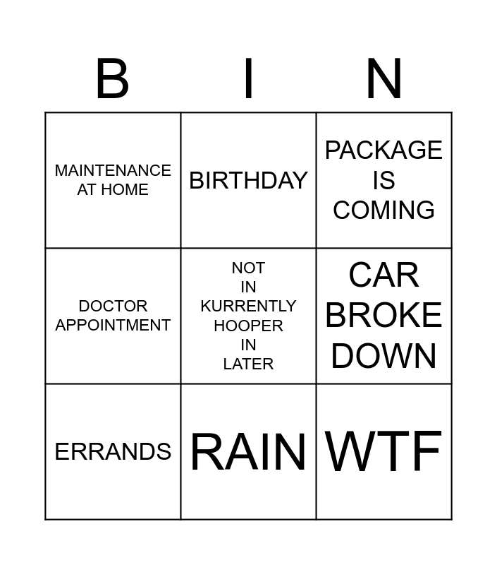 This bingo card has a free space and 10 words: RAIN, PACKAGE IS COMING, MAINTENANCE AT HOME, WTF, DOCTOR APPOINTMENT, ERRANDS, BIRTHDAY, SICK, CAR BROKE DOWN and FAMILY / PERSONAL.