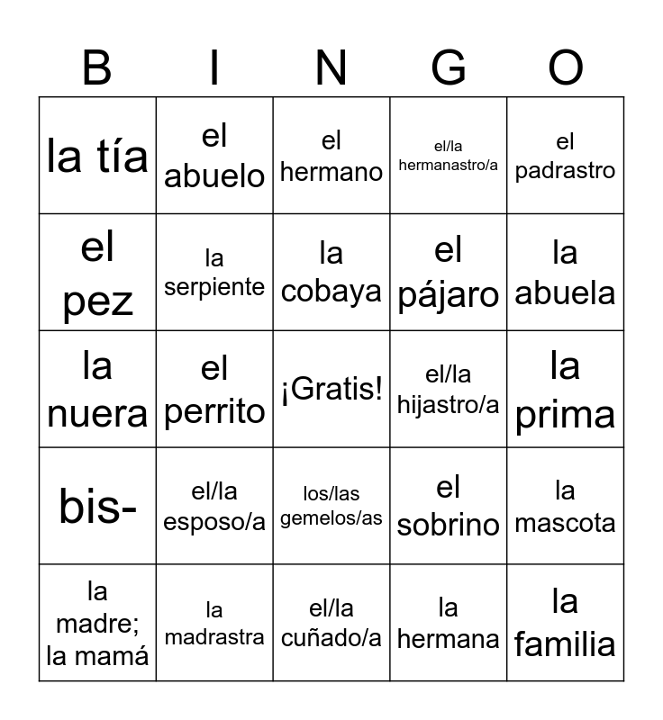 This bingo card has a free space and 43 words: el miembro, la familia, las parientes, la madre; la mamá, el padre; el papá, la hermana, el hermano, el hijo único, el padrastro, la madrastra, el/la hermanastro/a, el/la hijastro/a, los/las gemelos/as, el/la esposo/a, el/la novio/a, el/la cuñado/a, el/la suegro/a, la nuera, el yerno, la abuela, el abuelo, la nieta, el nieto, la tía, el tío, la prima, el primo, la sobrina, el sobrino, bis-, tatar-, la mascota, el perro, el perrito, el gato, el gatito, el hámster, la cobaya, el pez, el pájaro, la tortuga, la serpiente and el ratón.