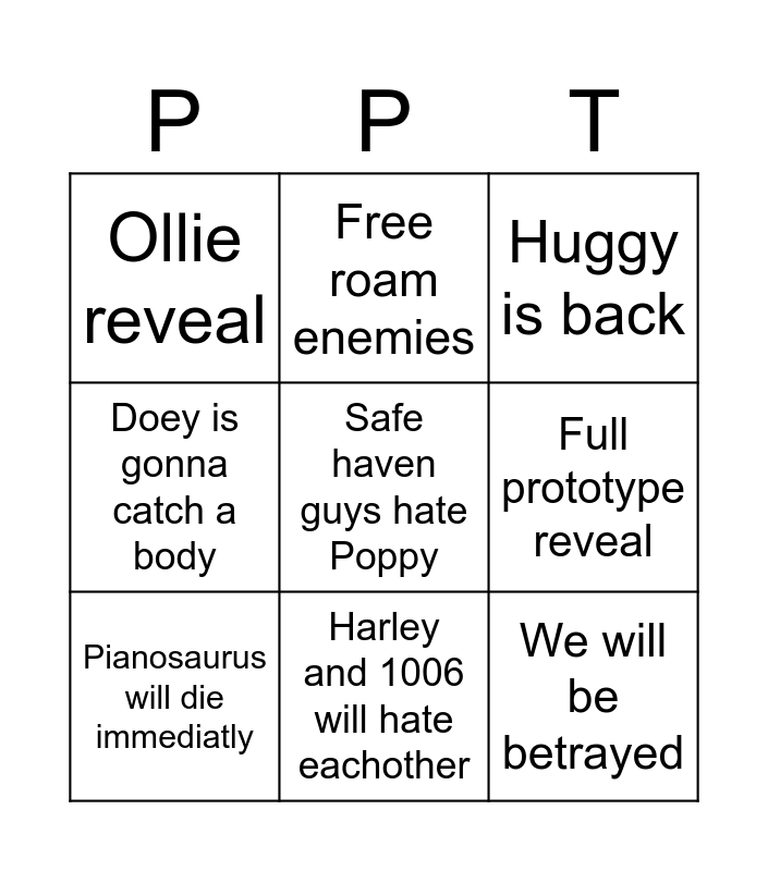 This bingo card has a free space and 8 words: Full prototype reveal, Huggy is back, Free roam enemies, Pianosaurus will die immediatly, Ollie reveal, We will be betrayed, Doey is gonna catch a body and Harley and 1006 will hate eachother.
