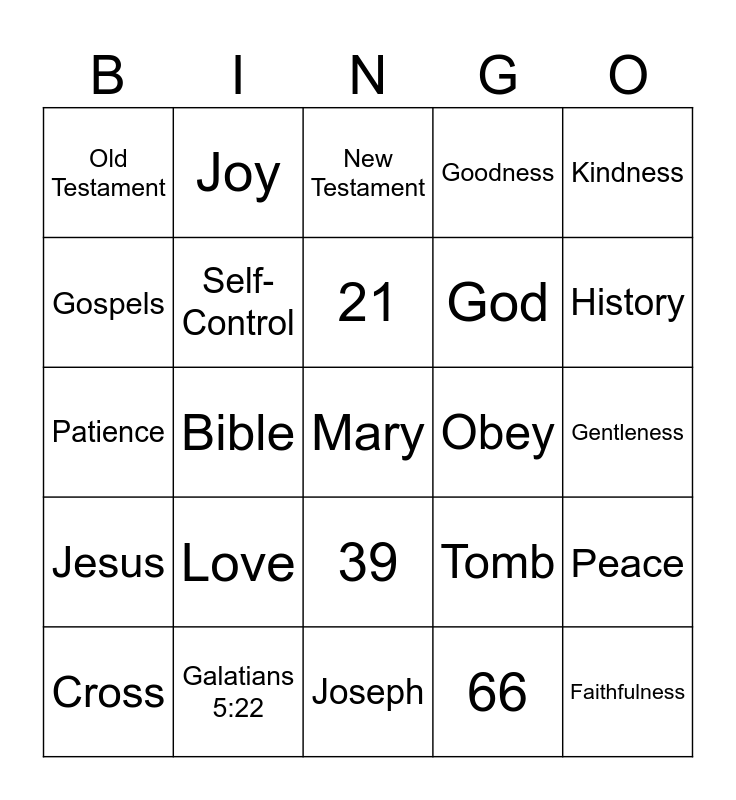 This bingo card has a free space and 24 words: Love, Galatians 5:22, 21, Cross, Kindness, Old Testament, Gospels, Joy, Obey, 39, God, Patience, Tomb, Peace, Self-Control, 66, Gentleness, New Testament, History, Bible, Faithfulness, Jesus, Goodness and Joseph.