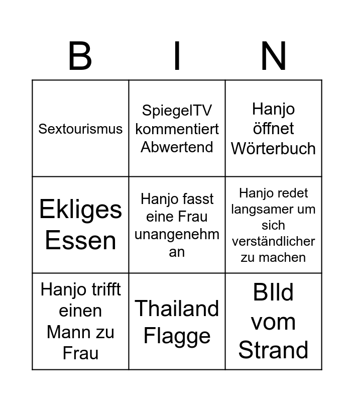 This bingo card has a free space and 8 words: Hanjo redet langsamer um sich verständlicher zu machen, Hanjo öffnet Wörterbuch, SpiegelTV kommentiert Abwertend, Hanjo trifft einen Mann zu Frau, Sextourismus, BIld vom Strand, Ekliges Essen and Thailand Flagge.
