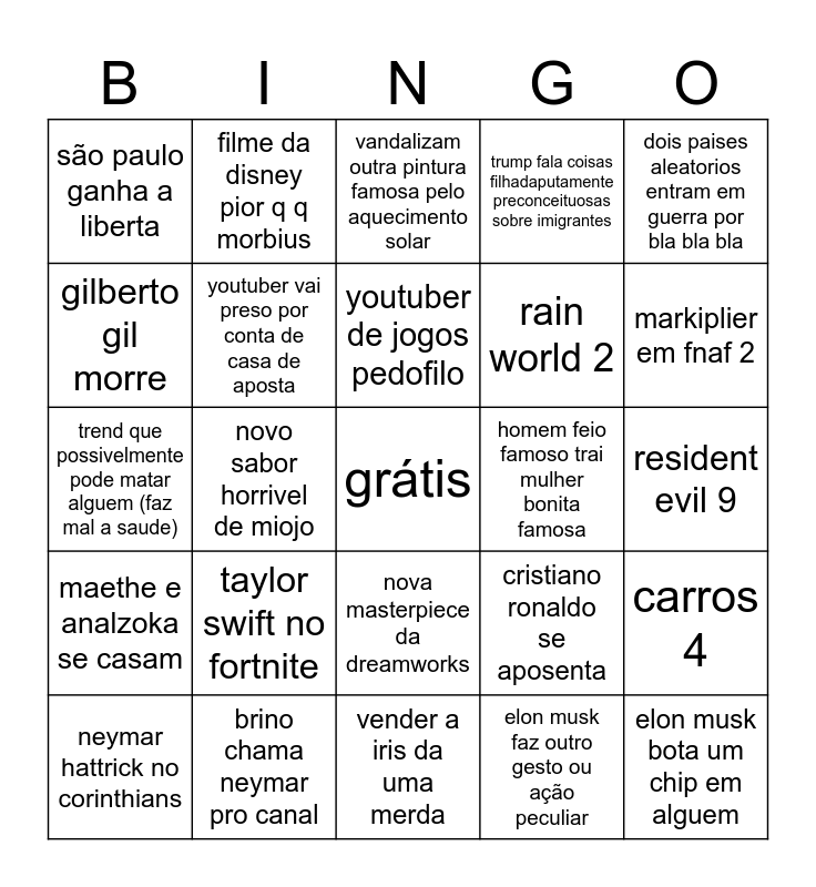This bingo card has a free space and 24 words: neymar hattrick no corinthians, taylor swift no fortnite, youtuber de jogos pedofilo, elon musk faz outro gesto ou ação peculiar, dois paises aleatorios entram em guerra por bla bla bla, são paulo ganha a liberta, filme da disney pior q q morbius, vandalizam outra pintura famosa pelo aquecimento solar, homem feio famoso trai mulher bonita famosa, resident evil 9, trend que possivelmente pode matar alguem (faz mal a saude), youtuber vai preso por conta de casa de aposta, cristiano ronaldo se aposenta, carros 4, gilberto gil morre, brino chama neymar pro canal, vender a iris da uma merda, trump fala coisas filhadaputamente preconceituosas sobre imigrantes, markiplier em fnaf 2, maethe e analzoka se casam, novo sabor horrivel de miojo, nova masterpiece da dreamworks, rain world 2 and elon musk bota um chip em alguem.