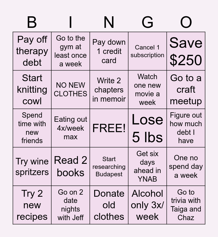 This bingo card has a free space and 24 words: Read 2 books, Go on 2 date nights with Jeff, Write 2 chapters in memoir, Try 2 new recipes, Save $250, Pay off therapy debt, Start knitting cowl, Go to the gym at least once a week, Lose 5 lbs, Start researching Budapest, Watch one new movie a week, Spend time with new friends, Get six days ahead in YNAB, One no spend day a week, NO NEW CLOTHES, Alcohol only 3x/ week, Figure out how much debt I have, Pay down 1 credit card, Go to a craft meetup, Eating out 4x/week max, Go to trivia with Taiga and Chaz, Try wine spritzers, Cancel 1 subscription and Donate old clothes.
