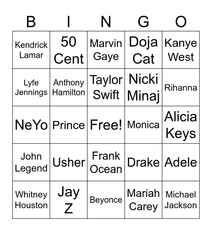 This bingo card has a free space and 29 words: Whitney Houston, Stevie Wonder, Prince, Bruno Mars, Kendrick Lamar, Marvin Gaye, Anthony Hamilton, Usher, Monica, Jay Z, Alicia Keys, Michael Jackson, Beyonce, Mariah Carey, Rihanna, SZA, Frank Ocean, John Legend, Kanye West, NeYo, Drake, Pharrel Williams, Nicki Minaj, Lyfe Jennings, Doja Cat, 50 Cent, Adele, Taylor Swift and Chris Brown.