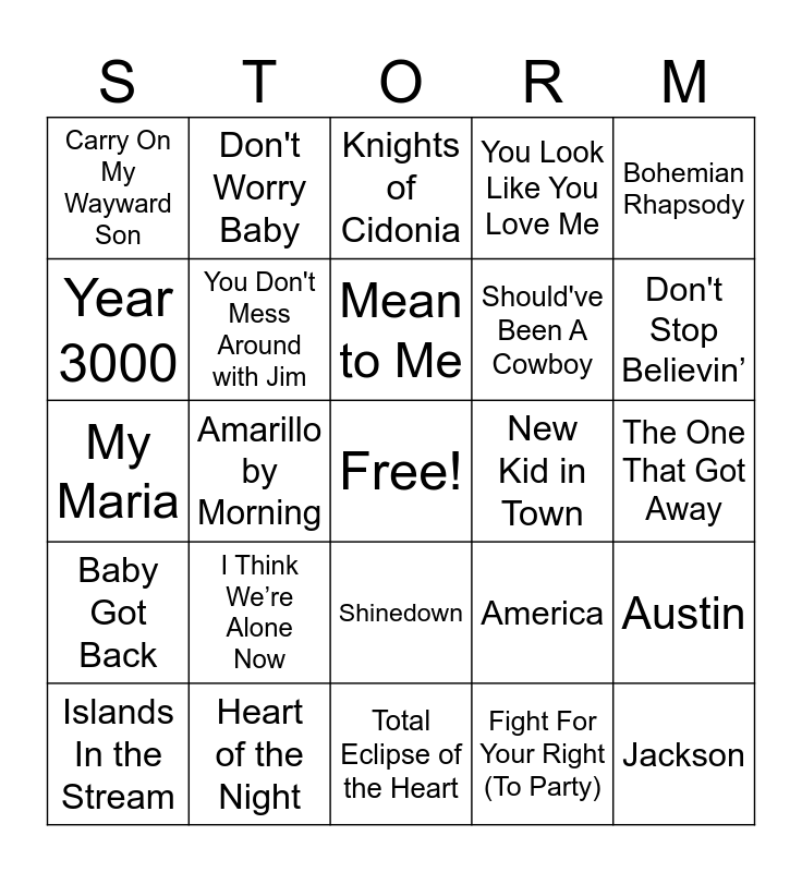 This bingo card has a free space and 67 words: Hey Soul Sister, Soul, Leader of the Pack, Austin, At Last, Don't Take the Girl, Don't Worry Baby, Any Man of Mine, Mean to Me, Good Day, Shinedown, Have You Ever Seen the Rain, The One That Got Away, Bohemian Rhapsody, Kokomo, Year 3000, Amarillo by Morning, Carry On My Wayward Son, More Than A Feeling, Should've Been A Cowboy, I Think We’re Alone Now, Baby Got Back, You Look Like You Love Me, Fight For Your Right (To Party), I Still Haven't Found What I'm Looking For, Shut Up and Dance, Believe, Copperhead Road, Don't Stop Believin’, I'm In a Hurry, Jackson, Shallow, Take Me Home, Country Roads, Battle of New Orleans, Beer For My Horses, Islands In the Stream, Love Walks In, America, My Maria, Beth, the Killers, You Don't Mess Around with Jim, New Kid in Town, Misery, Roll with the Changes, Winning, Wave on Wave, Heart of the Night, Africa, New Year's Day, Knights of Cidonia, The Teacher, Fox on the Run, Pour Some Sugar on Me, Raise Your Glass, Total Eclipse of the Heart, Puttin’ on the Ritz, Superstition, Parachute, Thrill of It, Bawitdaba, Hooked on an 8 Second Ride, Time, If I Had $1000000, Lay Down Sally, Piano Man and In the Air Tonight.