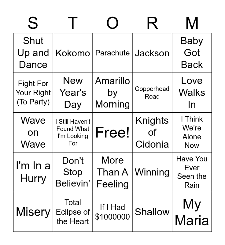 This bingo card has a free space and 67 words: Mean to Me, Good Day, Shinedown, Have You Ever Seen the Rain, The One That Got Away, Bohemian Rhapsody, Kokomo, Year 3000, Amarillo by Morning, Carry On My Wayward Son, More Than A Feeling, Should've Been A Cowboy, I Think We’re Alone Now, Baby Got Back, You Look Like You Love Me, Fight For Your Right (To Party), I Still Haven't Found What I'm Looking For, Shut Up and Dance, Believe, Copperhead Road, Don't Stop Believin’, I'm In a Hurry, Jackson, Shallow, Take Me Home, Country Roads, Battle of New Orleans, Beer For My Horses, Islands In the Stream, Love Walks In, America, My Maria, Beth, the Killers, You Don't Mess Around with Jim, New Kid in Town, Misery, Roll with the Changes, Winning, Wave on Wave, Heart of the Night, Africa, New Year's Day, Knights of Cidonia, The Teacher, Fox on the Run, Pour Some Sugar on Me, Raise Your Glass, Total Eclipse of the Heart, Puttin’ on the Ritz, Superstition, Parachute, Thrill of It, Bawitdaba, Hooked on an 8 Second Ride, Time, If I Had $1000000, Lay Down Sally, Piano Man, In the Air Tonight, Hey Soul Sister, Soul, Leader of the Pack, Austin, At Last, Don't Take the Girl, Don't Worry Baby and Any Man of Mine.