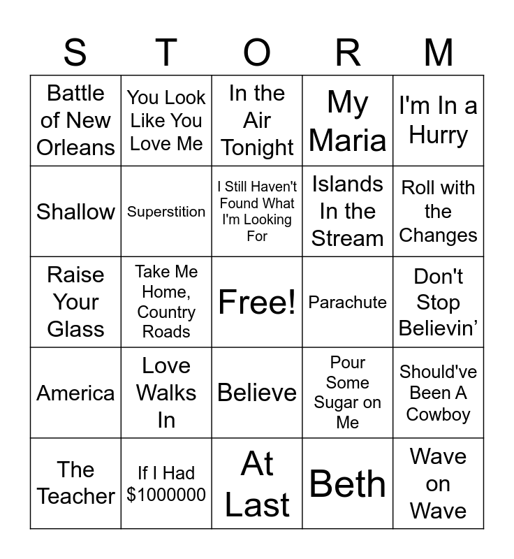 This bingo card has a free space and 67 words: Amarillo by Morning, Carry On My Wayward Son, More Than A Feeling, Should've Been A Cowboy, I Think We’re Alone Now, Baby Got Back, You Look Like You Love Me, Fight For Your Right (To Party), I Still Haven't Found What I'm Looking For, Shut Up and Dance, Believe, Copperhead Road, Don't Stop Believin’, I'm In a Hurry, Jackson, Shallow, Take Me Home, Country Roads, Battle of New Orleans, Beer For My Horses, Islands In the Stream, Love Walks In, America, My Maria, Beth, the Killers, You Don't Mess Around with Jim, New Kid in Town, Misery, Roll with the Changes, Winning, Wave on Wave, Heart of the Night, Africa, New Year's Day, Knights of Cidonia, The Teacher, Fox on the Run, Pour Some Sugar on Me, Raise Your Glass, Total Eclipse of the Heart, Puttin’ on the Ritz, Superstition, Parachute, Thrill of It, Bawitdaba, Hooked on an 8 Second Ride, Time, If I Had $1000000, Lay Down Sally, Piano Man, In the Air Tonight, Hey Soul Sister, Soul, Leader of the Pack, Austin, At Last, Don't Take the Girl, Don't Worry Baby, Any Man of Mine, Mean to Me, Good Day, Shinedown, Have You Ever Seen the Rain, The One That Got Away, Bohemian Rhapsody, Kokomo and Year 3000.