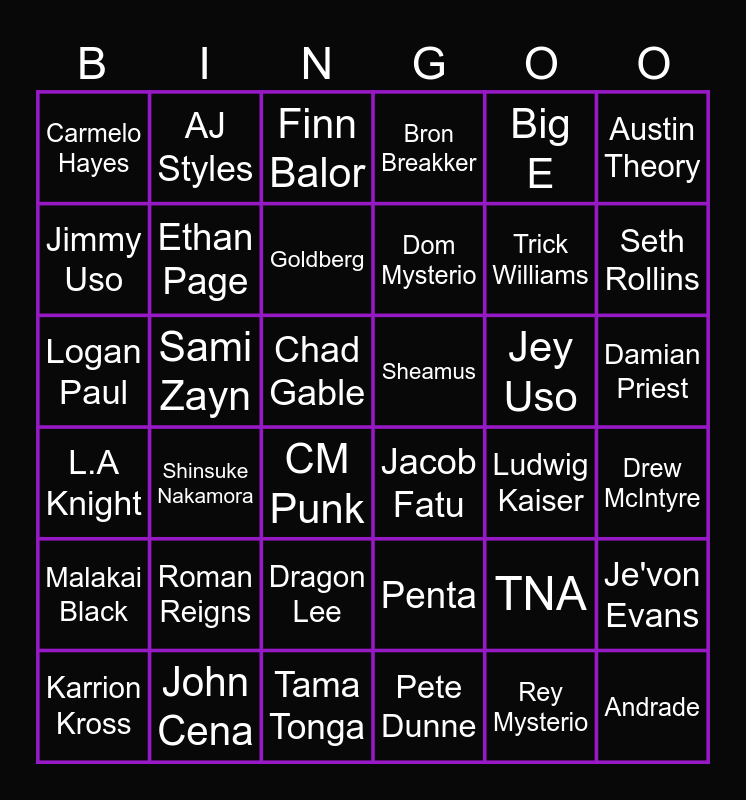 This bingo card has 36 words: L.A Knight, Shinsuke Nakamora, Tama Tonga, Dom Mysterio, Jey Uso, Damian Priest, Carmelo Hayes, John Cena, Finn Balor, Penta, Trick Williams, Austin Theory, Malakai Black, Sami Zayn, Goldberg, Bron Breakker, TNA, Drew McIntyre, Jimmy Uso, Ethan Page, CM Punk, Jacob Fatu, Ludwig Kaiser, Je'von Evans, Logan Paul, AJ Styles, Chad Gable, Pete Dunne, Big E, Seth Rollins, Karrion Kross, Roman Reigns, Dragon Lee, Sheamus, Rey Mysterio and Andrade.