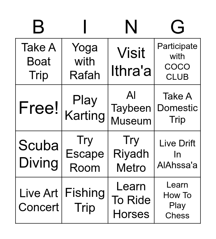 This bingo card has 16 words: Fishing Trip, Live Drift In AlAhssa'a, Visit Ithra'a, Take A Boat Trip, Scuba Diving, Yoga with Rafah, Try Riyadh Metro, Learn To Ride Horses, Free!, Play Karting, Live Art Concert, Participate with COCO CLUB, Try Escape Room, Take A Domestic Trip, Al Taybeen Museum and Learn How To Play Chess.