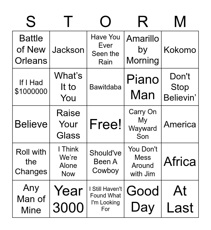 This bingo card has a free space and 45 words: Hey Soul Sister, At Last, Don't Take the Girl, Any Man of Mine, Mean to Me, Good Day, Have You Ever Seen the Rain, The One That Got Away, Kokomo, Year 3000, Amarillo by Morning, Carry On My Wayward Son, Should've Been A Cowboy, I Think We’re Alone Now, Fight For Your Right (To Party), I Still Haven't Found What I'm Looking For, Shut Up and Dance, Believe, Copperhead Road, Don't Stop Believin’, Jackson, Shallow, Take Me Home, Country Roads, Battle of New Orleans, Islands In the Stream, America, Beth, the Killers, You Don't Mess Around with Jim, Roll with the Changes, Heart of the Night, Africa, Knights of Cidonia, Fox on the Run, Pour Some Sugar on Me, Raise Your Glass, Total Eclipse of the Heart, Puttin’ on the Ritz, Superstition, Bawitdaba, If I Had $1000000, Piano Man, Lead Me On, What’s It to You and Dust on the Bottle.