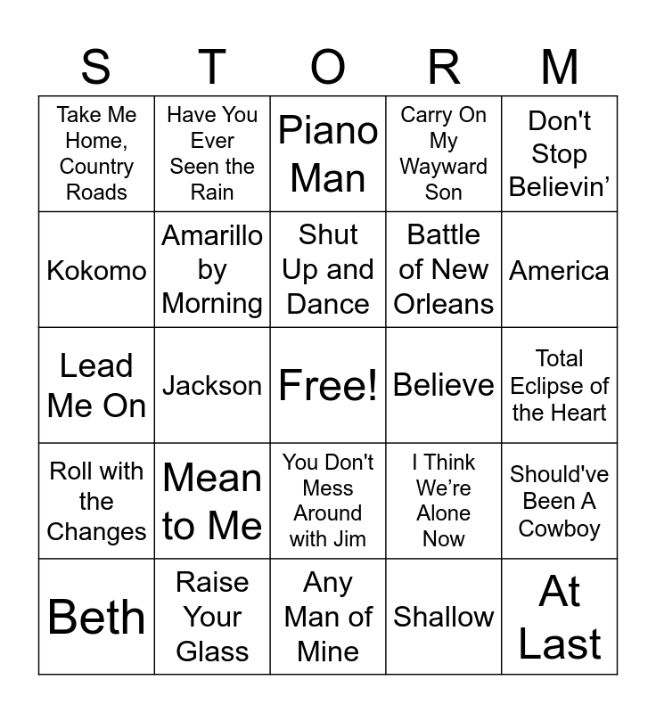 This bingo card has a free space and 46 words: Hey Soul Sister, At Last, Don't Take the Girl, Any Man of Mine, Mean to Me, Good Day, Have You Ever Seen the Rain, The One That Got Away, Kokomo, Year 3000, Amarillo by Morning, Carry On My Wayward Son, Should've Been A Cowboy, I Think We’re Alone Now, Fight For Your Right (To Party), I Still Haven't Found What I'm Looking For, Shut Up and Dance, Believe, Copperhead Road, Don't Stop Believin’, Jackson, Shallow, Take Me Home, Country Roads, Battle of New Orleans, Islands In the Stream, America, Beth, the Killers, You Don't Mess Around with Jim, Roll with the Changes, Heart of the Night, Africa, Knights of Cidonia, Fox on the Run, Pour Some Sugar on Me, Raise Your Glass, Total Eclipse of the Heart, Puttin’ on the Ritz, Superstition, Bawitdaba, If I Had $1000000, Piano Man, Lead Me On, What’s It to You, Dust on the Bottle and Hangin' Tough.