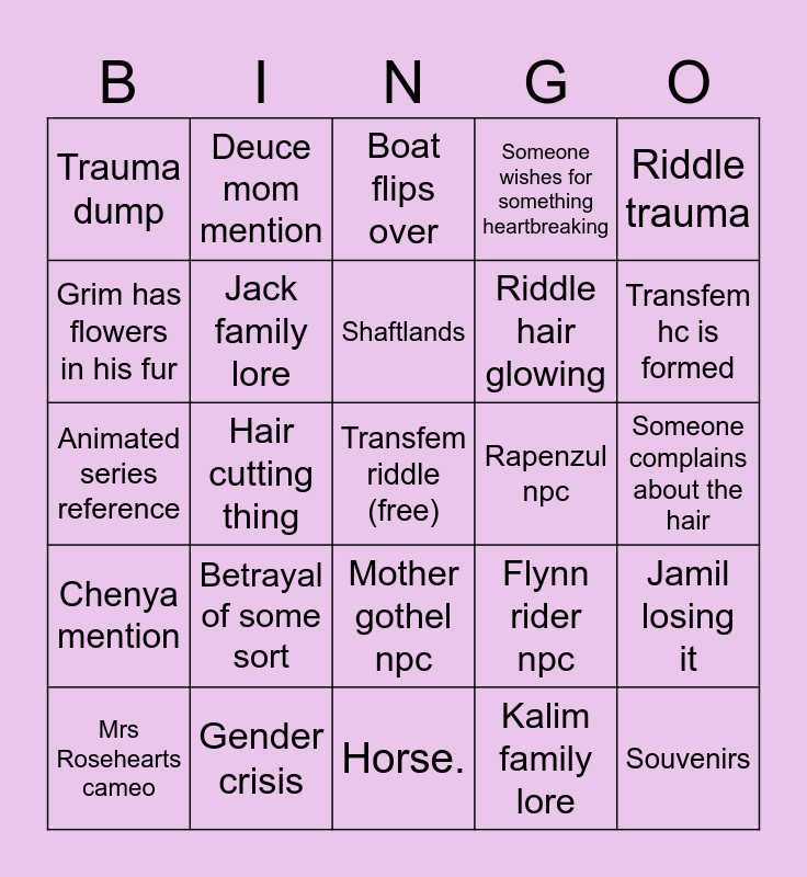 This bingo card has a free space and 24 words: Betrayal of some sort, Gender crisis, Shaftlands, Mrs Rosehearts cameo, Riddle trauma, Trauma dump, Grim has flowers in his fur, Deuce mom mention, Rapenzul npc, Mother gothel npc, Riddle hair glowing, Animated series reference, Flynn rider npc, Jamil losing it, Jack family lore, Kalim family lore, Someone complains about the hair, Boat flips over, Transfem hc is formed, Hair cutting thing, Souvenirs, Chenya mention, Someone wishes for something heartbreaking and Horse..