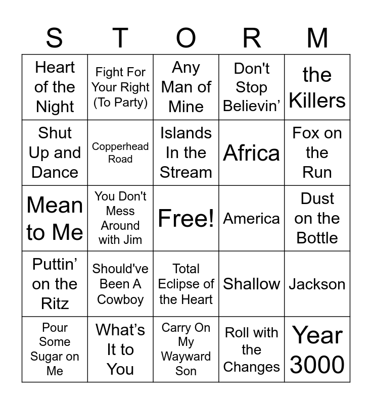This bingo card has a free space and 46 words: Kokomo, Year 3000, Amarillo by Morning, Carry On My Wayward Son, Should've Been A Cowboy, I Think We’re Alone Now, Fight For Your Right (To Party), I Still Haven't Found What I'm Looking For, Shut Up and Dance, Believe, Copperhead Road, Don't Stop Believin’, Jackson, Shallow, Take Me Home, Country Roads, Battle of New Orleans, Islands In the Stream, America, Beth, the Killers, You Don't Mess Around with Jim, Roll with the Changes, Heart of the Night, Africa, Knights of Cidonia, Fox on the Run, Pour Some Sugar on Me, Raise Your Glass, Total Eclipse of the Heart, Puttin’ on the Ritz, Superstition, Bawitdaba, If I Had $1000000, Piano Man, Lead Me On, What’s It to You, Dust on the Bottle, Hangin' Tough, Hey Soul Sister, At Last, Don't Take the Girl, Any Man of Mine, Mean to Me, Good Day, Have You Ever Seen the Rain and The One That Got Away.