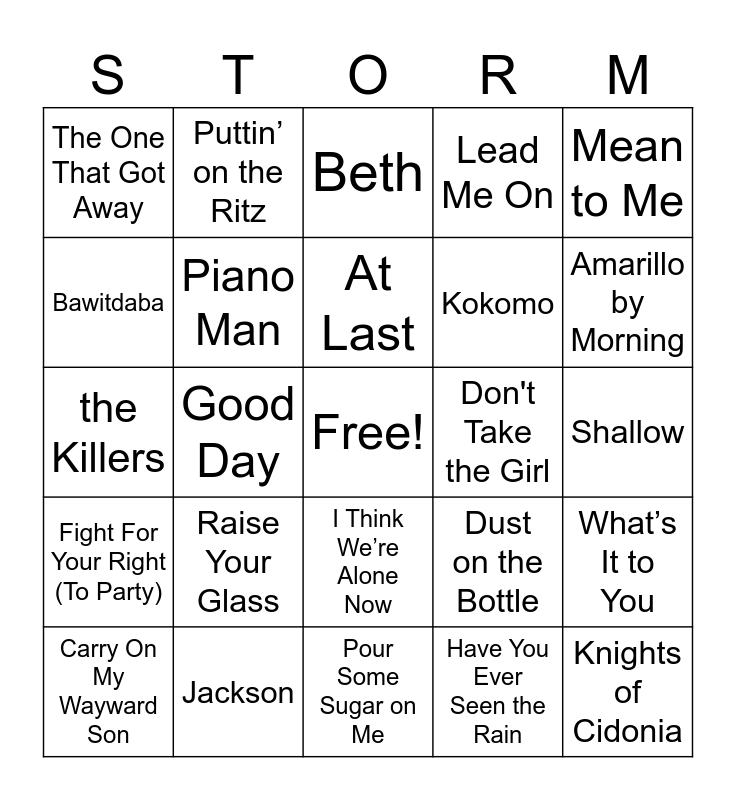 This bingo card has a free space and 46 words: Africa, Knights of Cidonia, Fox on the Run, Pour Some Sugar on Me, Raise Your Glass, Total Eclipse of the Heart, Puttin’ on the Ritz, Superstition, Bawitdaba, If I Had $1000000, Piano Man, Lead Me On, What’s It to You, Dust on the Bottle, Hangin' Tough, Hey Soul Sister, At Last, Don't Take the Girl, Any Man of Mine, Mean to Me, Good Day, Have You Ever Seen the Rain, The One That Got Away, Kokomo, Year 3000, Amarillo by Morning, Carry On My Wayward Son, Should've Been A Cowboy, I Think We’re Alone Now, Fight For Your Right (To Party), I Still Haven't Found What I'm Looking For, Shut Up and Dance, Believe, Copperhead Road, Don't Stop Believin’, Jackson, Shallow, Take Me Home, Country Roads, Battle of New Orleans, Islands In the Stream, America, Beth, the Killers, You Don't Mess Around with Jim, Roll with the Changes and Heart of the Night.