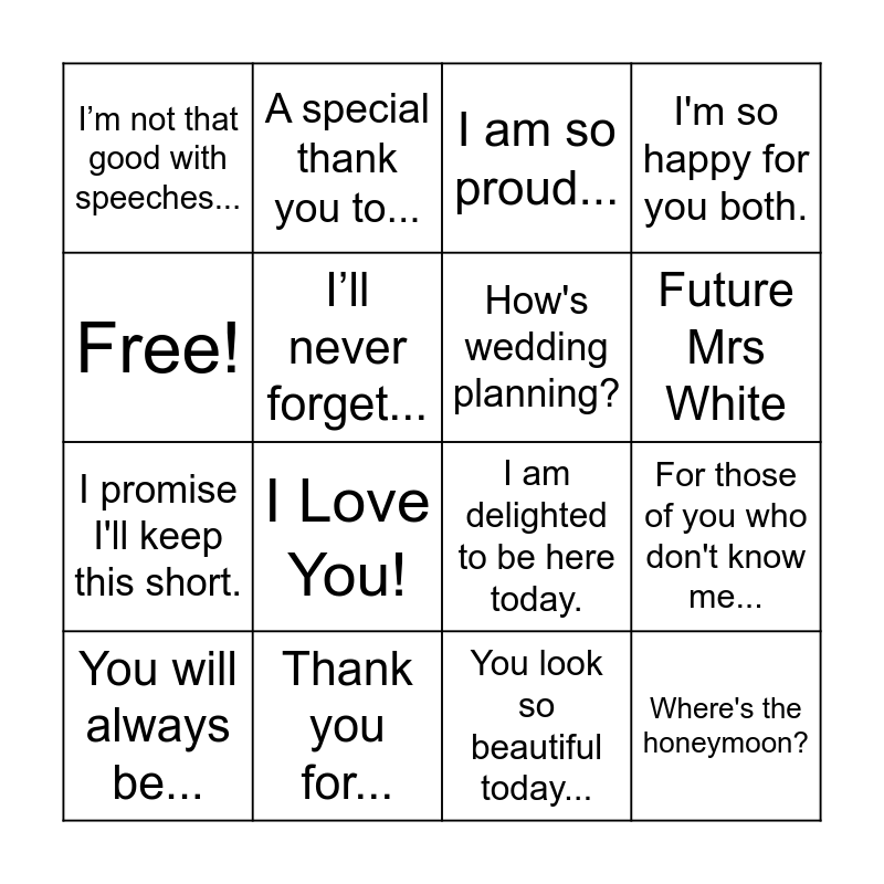 This bingo card has 16 words: Thank you for..., For those of you who don't know me..., I am so proud..., I’m not that good with speeches..., I promise I'll keep this short., A special thank you to..., I am delighted to be here today., You look so beautiful today..., Free!, I’ll never forget..., You will always be..., I'm so happy for you both., I Love You!, Future Mrs White, How's wedding planning? and Where's the honeymoon?.