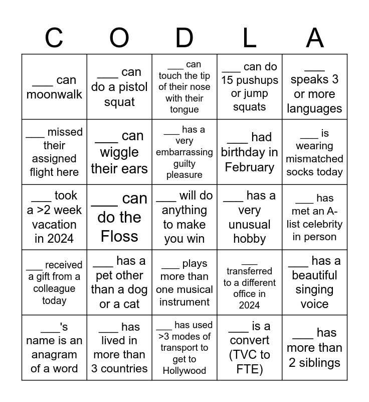 This bingo card has a free space and 29 words: ___'s name is an anagram of a word, ___ can do a handstand, ___ can do the Floss, ___ can make a convincing impression of a celebrity, ___ can moonwalk, ___ can touch the tip of their nose with their tongue, ___ can wiggle their ears, ___ has a pet other than a dog or a cat, ___ has a very unusual hobby, ___ has lived in more than 3 countries, ___ has met an A-list celebrity in person, ___ has more than 2 siblings, ___ has used >3 modes of transport to get to Hollywood, ___ is a convert (TVC to FTE), ___ is wearing mismatched socks today, ___ joined COD in the last 6 months, ___ plays more than one musical instrument, ___ received a gift from a colleague today, ___ speaks 3 or more languages, ___ took a >2 week vacation in 2024, ___ transferred to a different office in 2024, ___ was named after a celebrity, ___ had birthday in February, ___ missed their assigned flight here, ___ can do 15 pushups or jump squats, ___ can do a pistol squat, ___ has a beautiful singing voice, ___ has a very embarrassing guilty pleasure and ___ got promoted in 2024.