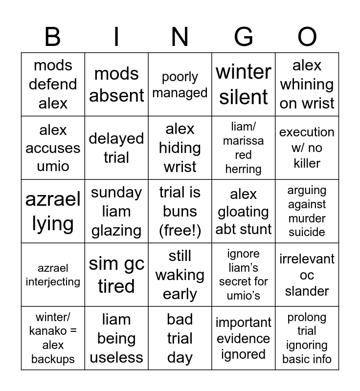 This bingo card has a free space and 24 words: sim gc tired, liam being useless, alex hiding wrist, winter/ kanako = alex backups, alex whining on wrist, mods defend alex, alex accuses umio, mods absent, alex gloating abt stunt, still waking early, liam/ marissa red herring, azrael lying, ignore liam’s secret for umio’s, irrelevant oc slander, delayed trial, important evidence ignored, arguing against murder suicide, poorly managed, execution w/ no killer, sunday liam glazing, prolong trial ignoring basic info, azrael interjecting, winter silent and bad trial day.