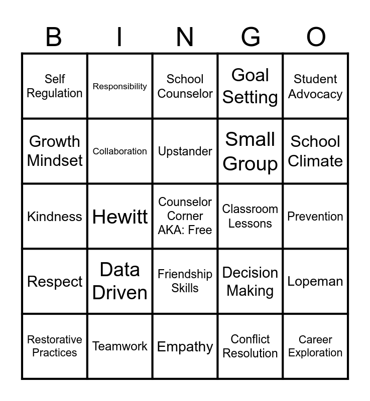 This bingo card has a free space and 34 words: DEI, Conflict Resolution, Mindfulness, Leadership Skills, Respect, Collaboration, Student Advocacy, Restorative Practices, Responsibility, SEL, Upstander, School Counselor, Academic Success, Coping Strategies, Classroom Lessons, School Climate, Teamwork, Kindness, Data Driven, Decision Making, Friendship Skills, ASCA (American School Counselor Association), Self Regulation, Prevention, Empathy, Career Exploration, Goal Setting, Social Skills, Small Group, Growth Mindset, Listen, Hewitt, Lopeman and Ekerman.