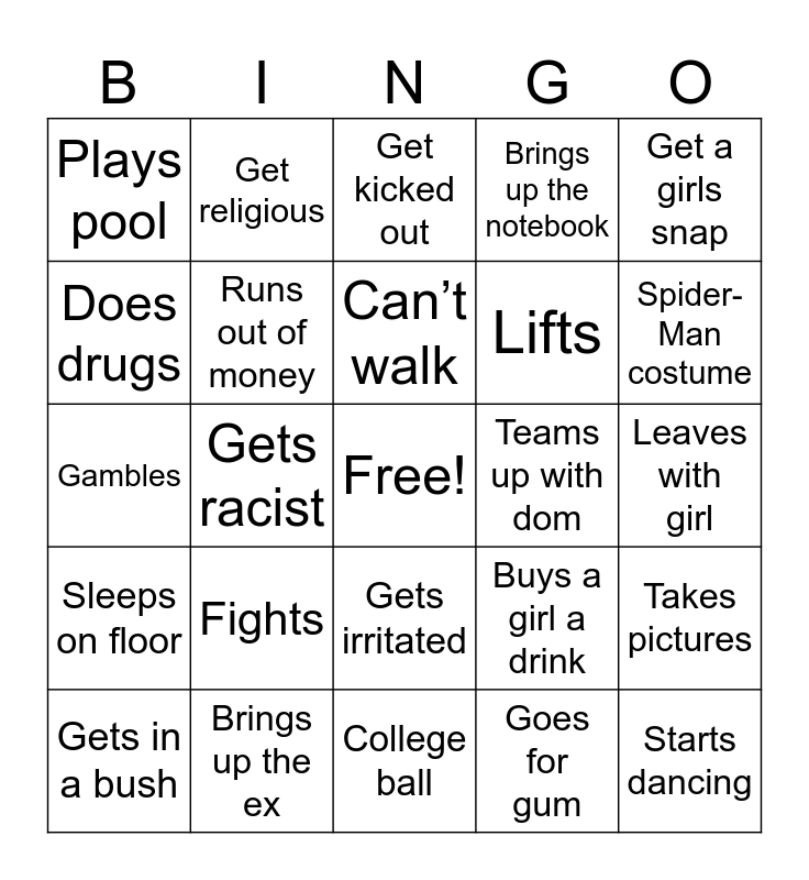 This bingo card has a free space and 24 words: Fights, Brings up the ex, Can’t walk, Gets in a bush, Get a girls snap, Plays pool, Does drugs, Get religious, Teams up with dom, Gets irritated, Lifts, Gambles, Buys a girl a drink, Takes pictures, Runs out of money, Goes for gum, Leaves with girl, Get kicked out, Spider-Man costume, Gets racist, Starts dancing, Sleeps on floor, Brings up the notebook and College ball.