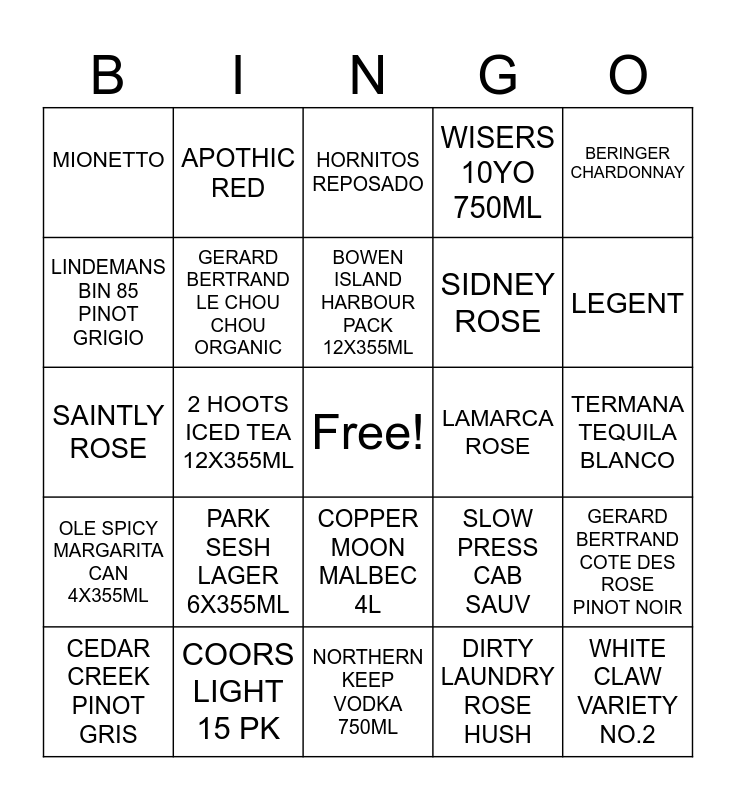 This bingo card has a free space and 24 words: PARK SESH LAGER 6X355ML, COORS LIGHT 15 PK, BOWEN ISLAND HARBOUR PACK 12X355ML, CEDAR CREEK PINOT GRIS, BERINGER CHARDONNAY, MIONETTO, LINDEMANS BIN 85 PINOT GRIGIO, APOTHIC RED, LAMARCA ROSE, COPPER MOON MALBEC 4L, SIDNEY ROSE, SAINTLY ROSE, SLOW PRESS CAB SAUV, GERARD BERTRAND COTE DES ROSE PINOT NOIR, GERARD BERTRAND LE CHOU CHOU ORGANIC, DIRTY LAUNDRY ROSE HUSH, TERMANA TEQUILA BLANCO, HORNITOS REPOSADO, LEGENT, 2 HOOTS ICED TEA 12X355ML, WHITE CLAW VARIETY NO.2, OLE SPICY MARGARITA CAN 4X355ML, WISERS 10YO 750ML and NORTHERN KEEP VODKA 750ML.