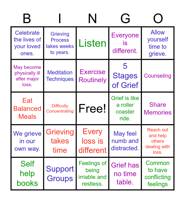 This bingo card has a free space and 24 words: Grieving takes time, Support Groups, Exercise Routinely, Self help books, Allow yourself time to grieve., Celebrate the lives of your loved ones., May become physically ill after major loss., Grieving Process takes weeks to years., Grief is like a roller coaster ride., Every loss is different, 5 Stages of Grief, Eat Balanced Meals, May feel numb and distracted., Reach out and help others dealing with loss., Meditation Techniques, Grief has no time table., Share Memories, Listen, Counseling, Difficulty Concentrating, Common to have conflicting feelings, We grieve in our own way., Everyone is different. and Feelings of being irriable and restless..