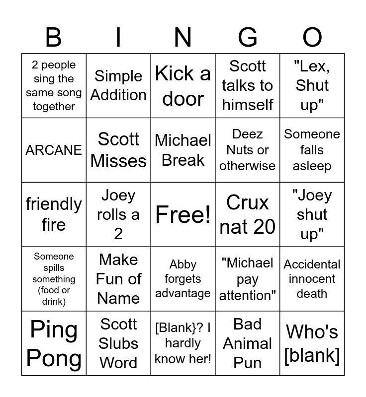 This bingo card has a free space and 24 words: Make Fun of Name, Scott Slubs Word, Michael Break, Ping Pong, "Lex, Shut up", 2 people sing the same song together, ARCANE, Simple Addition, Crux nat 20, Abby forgets advantage, Deez Nuts or otherwise, friendly fire, "Michael pay attention", Accidental innocent death, Scott Misses, Bad Animal Pun, "Joey shut up", Kick a door, Someone falls asleep, Joey rolls a 2, Who's [blank], Someone spills something (food or drink), Scott talks to himself and [Blank}? I hardly know her!.