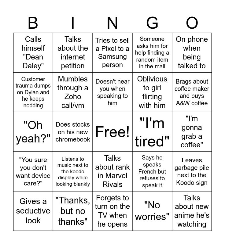 This bingo card has a free space and 24 words: Gives a seductive look, Listens to music next to the koodo display while looking blankly, Doesn't hear you when speaking to him, "No worries", On phone when being talked to, Calls himself "Dean Daley", Talks about the internet petition, Tries to sell a Pixel to a Samsung person, "I'm tired", "I'm gonna grab a coffee", "Oh yeah?", Mumbles through a Zoho call/vm, Says he speaks French but refuses to speak it, Leaves garbage pile next to the Koodo sign, Customer trauma dumps on Dylan and he keeps nodding, "Thanks, but no thanks", Forgets to turn on the TV when he opens, Someone asks him for help finding a random item in the mall, Brags about coffee maker and buys A&W coffee, "You sure you don't want device care?", Does stocks on his new chromebook, Talks about rank in Marvel Rivals, Oblivious to girl flirting with him and Talks about new anime he's watching.