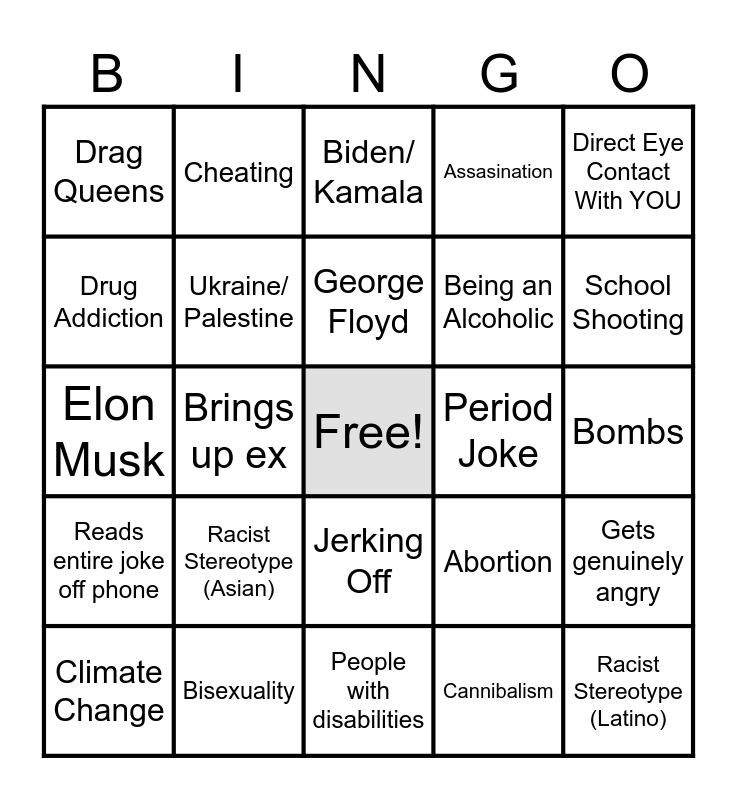 This bingo card has a free space and 39 words: Hitler, Racist Stereotype (Black), Making Lesbians Uncomfortable, Ukraine/ Palestine, Climate Change, Jerking Off, George Floyd, Trump, Direct Eye Contact With YOU, Reads entire joke off phone, Brings up ex, Assasination, Racist Stereotype (Latino), Bombs, Period Joke, Racist Stereotype (Asian), Suicide, Drag Queens, Mental Health, Abortion, Drug Addiction, People with disabilities, Being an Alcoholic, School Shooting, Homeless, Unemployed, Divorce, Dated Meme, "Cringe Culture", Cheating, Covid, 9/11, Biden/ Kamala, Bisexuality, Cannibalism, Tells someone to Kill Themself, Gets genuinely angry, Elon Musk and "IDK why I'm single".