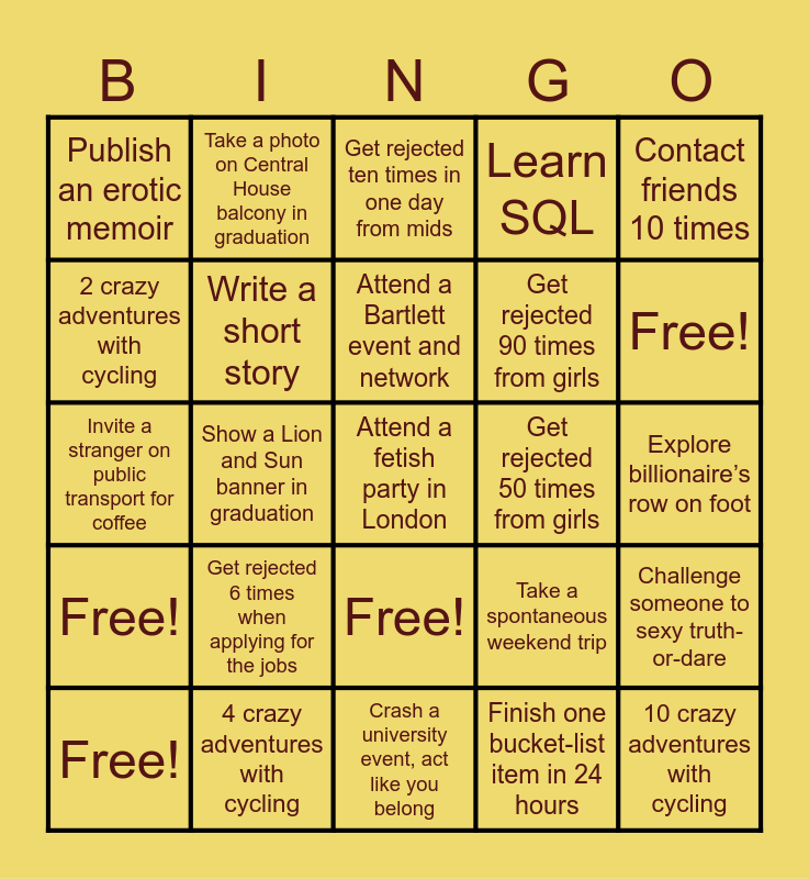 This bingo card has 26 words: Free!, Finish one bucket-list item in 24 hours, Attend a Bartlett event and network, 4 crazy adventures with cycling, Contact friends 10 times, Publish an erotic memoir, 2 crazy adventures with cycling, Take a photo on Central House balcony in graduation, Explore billionaire’s row on foot, Take a spontaneous weekend trip, Get rejected 90 times from girls, Invite a stranger on public transport for coffee, Challenge someone to sexy truth-or-dare, Free!, Show a Lion and Sun banner in graduation, Go to brighton's beach (nudist bonus point), Learn SQL, Free!, Get rejected ten times in one day from mids, Attend a fetish party in London, Free!, Crash a university event, act like you belong, Get rejected 50 times from girls, Get rejected 6 times when applying for the jobs, Write a short story and 10 crazy adventures with cycling.