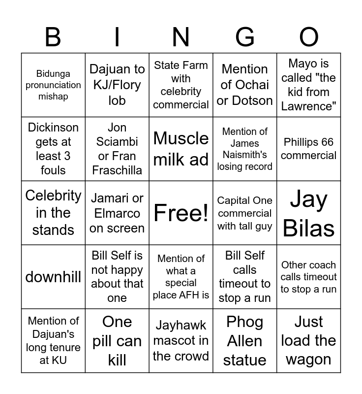 This bingo card has a free space and 24 words: Bill Self is not happy about that one, One pill can kill, Muscle milk ad, Mention of Dajuan's long tenure at KU, Mayo is called "the kid from Lawrence", Bidunga pronunciation mishap, Dickinson gets at least 3 fouls, Dajuan to KJ/Flory lob, Capital One commercial with tall guy, Mention of what a special place AFH is, Mention of James Naismith's losing record, Celebrity in the stands, Bill Self calls timeout to stop a run, Other coach calls timeout to stop a run, Jon Sciambi or Fran Fraschilla, Phog Allen statue, Jay Bilas, State Farm with celebrity commercial, Phillips 66 commercial, Jamari or Elmarco on screen, Just load the wagon, downhill, Mention of Ochai or Dotson and Jayhawk mascot in the crowd.