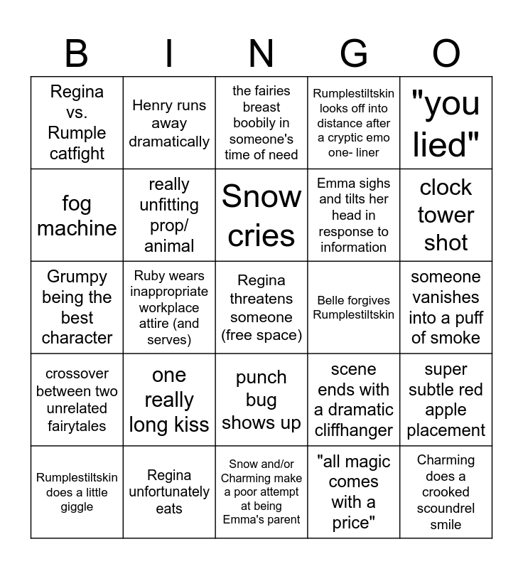 This bingo card has a free space and 24 words: one really long kiss, Regina unfortunately eats, Snow cries, Rumplestiltskin does a little giggle, "you lied", Regina vs. Rumple catfight, fog machine, Henry runs away dramatically, Belle forgives Rumplestiltskin, punch bug shows up, Emma sighs and tilts her head in response to information, Grumpy being the best character, scene ends with a dramatic cliffhanger, super subtle red apple placement, really unfitting prop/ animal, "all magic comes with a price", someone vanishes into a puff of smoke, the fairies breast boobily in someone's time of need, clock tower shot, Ruby wears inappropriate workplace attire (and serves), Charming does a crooked scoundrel smile, crossover between two unrelated fairytales, Rumplestiltskin looks off into distance after a cryptic emo one- liner and Snow and/or Charming make a poor attempt at being Emma's parent.